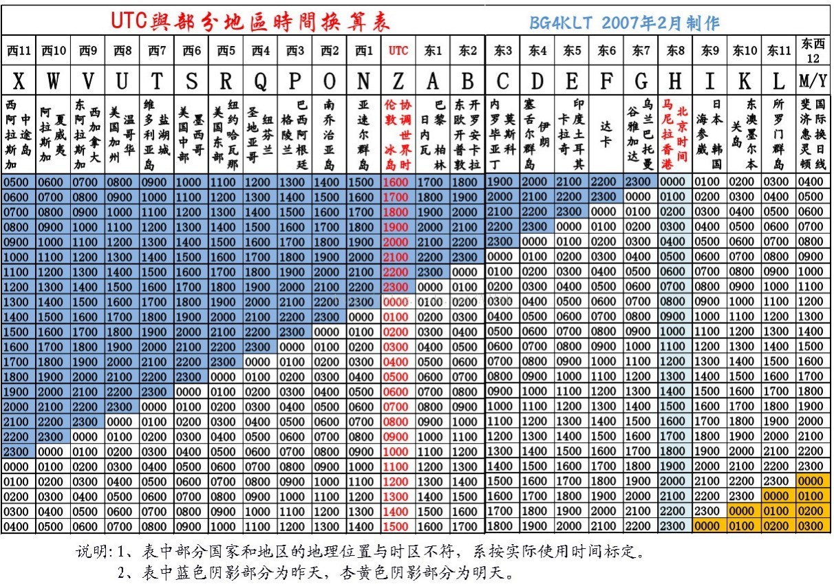 整个地球分为二十四时区,每个时区都有自己的本地时间。在国际无线电通信中,为统一而普遍使用一个标准时间,称为通用协调时(UTC, Universal Time Coordinated)。UTC与格林尼治平均时(GMT, Greenwich Mean Time)一样,都与英国伦敦的本地时相同。UTC与GMT含义完全相同。